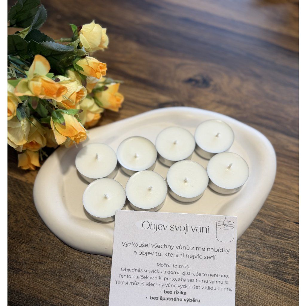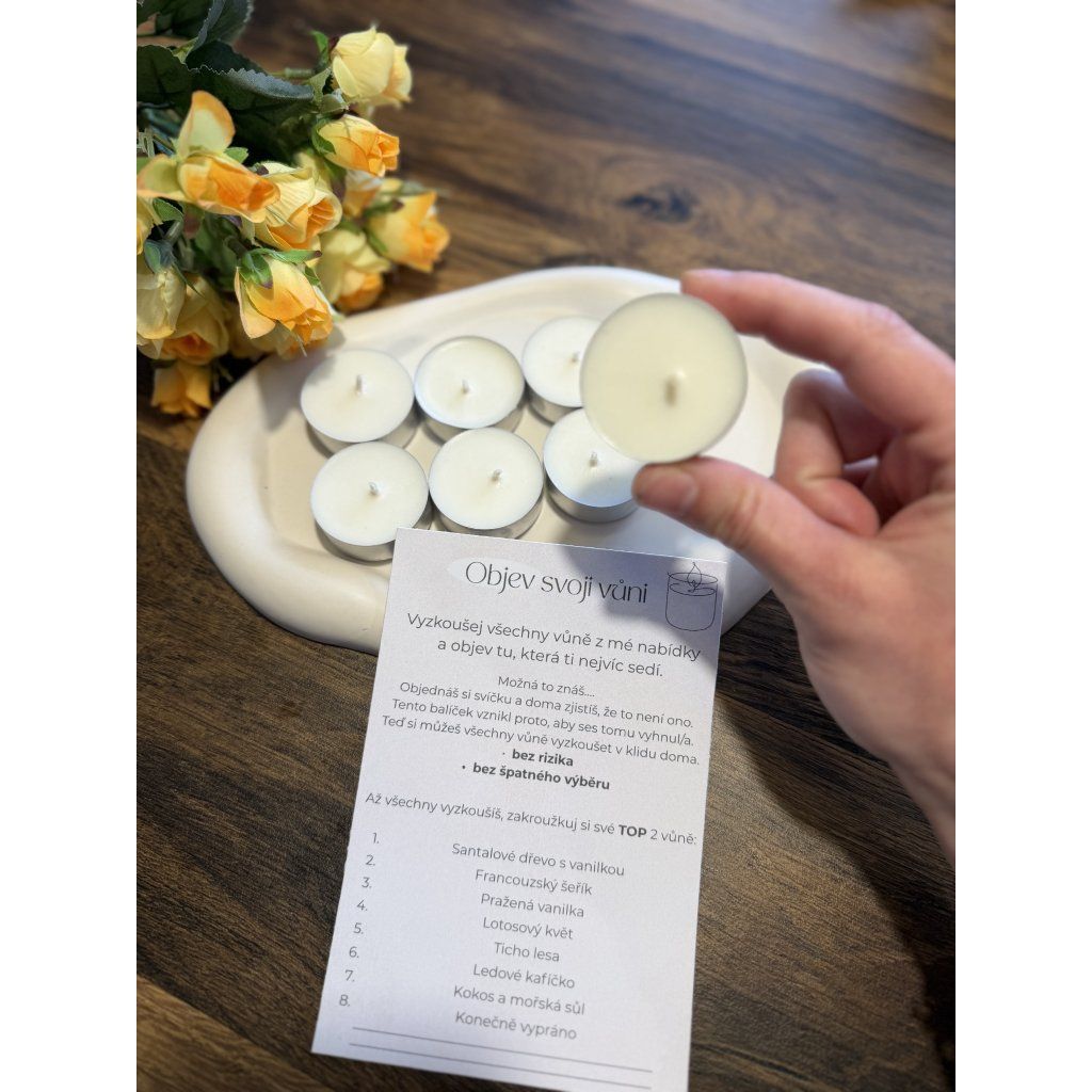 Nevíš, jaká vůně je pro tebe ta pravá? Připravila jsem zkušební balíček 8 čajových svíček, díky kterému si můžeš vyzkoušet všechny vůně z mé nabídky a najít tu, která ti bude nejvíc sedět. Chápu, že kupovat svíčky přes internet může být riskantní.